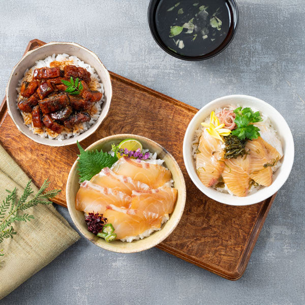 ■国産の鯛とカンパチを独自レシピの漬けたれで仕上げました。ほんのり香るたれの風味と鯛・カンパチの味わいをお楽しみください。しっかりとした味わいで焼き上げたうなぎ蒲焼を刻みました。ごはんによく合う仕上がりで山椒との風味が最高です。