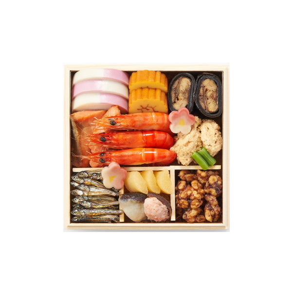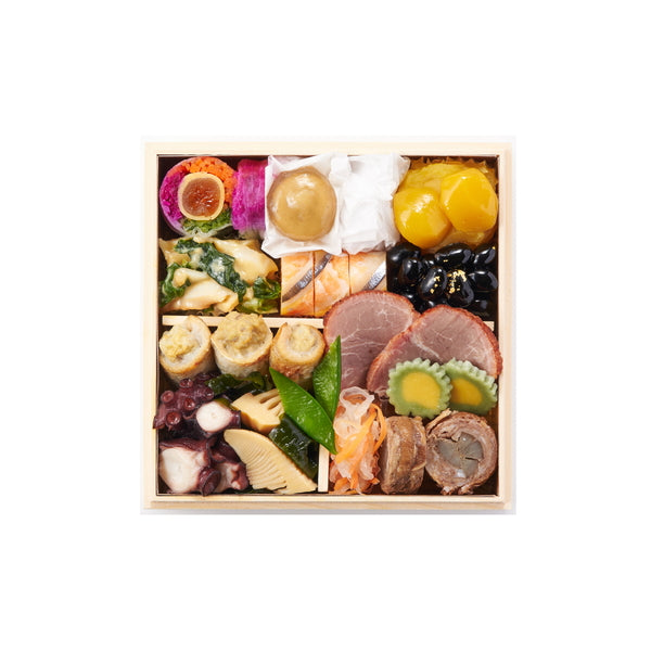 市松かまぼこ, 伊達巻, 鰊昆布巻, 紅白梅麩, 銀鮭西京焼, 浜汐海老, 鰤の子吉野煮, いんげん, 田作り, 数の子美味漬, 裏白しいたけ, 海老しいたけ, かつをくるみ