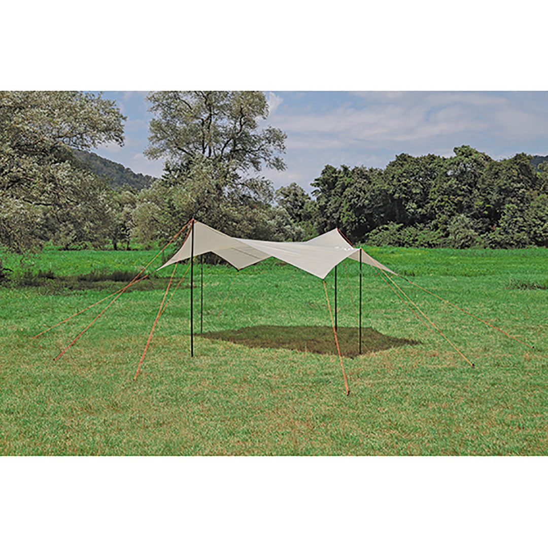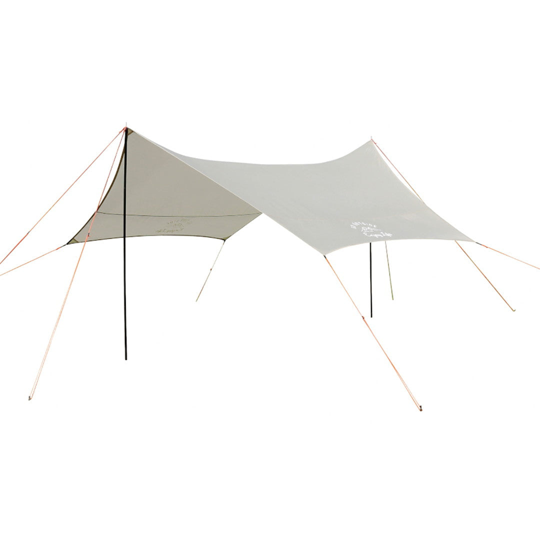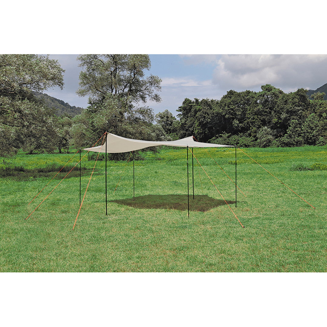 ■4~6人用に最適なリビングスペースを確保できるタープです。多彩なセッティングが可能な6角形型です。ループベルトと三角布で角コーナーを補強、引っ張り強度アップしています。持ち運びや収納に便利なキャリーバッグ付き。