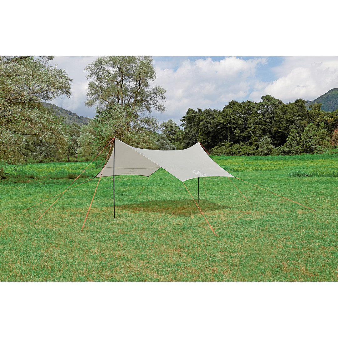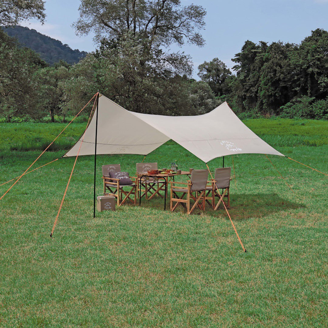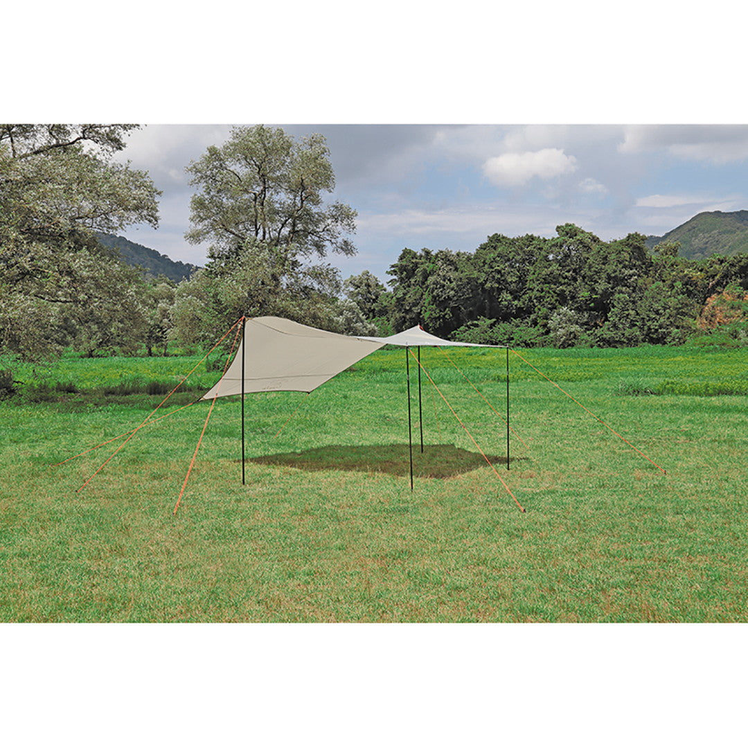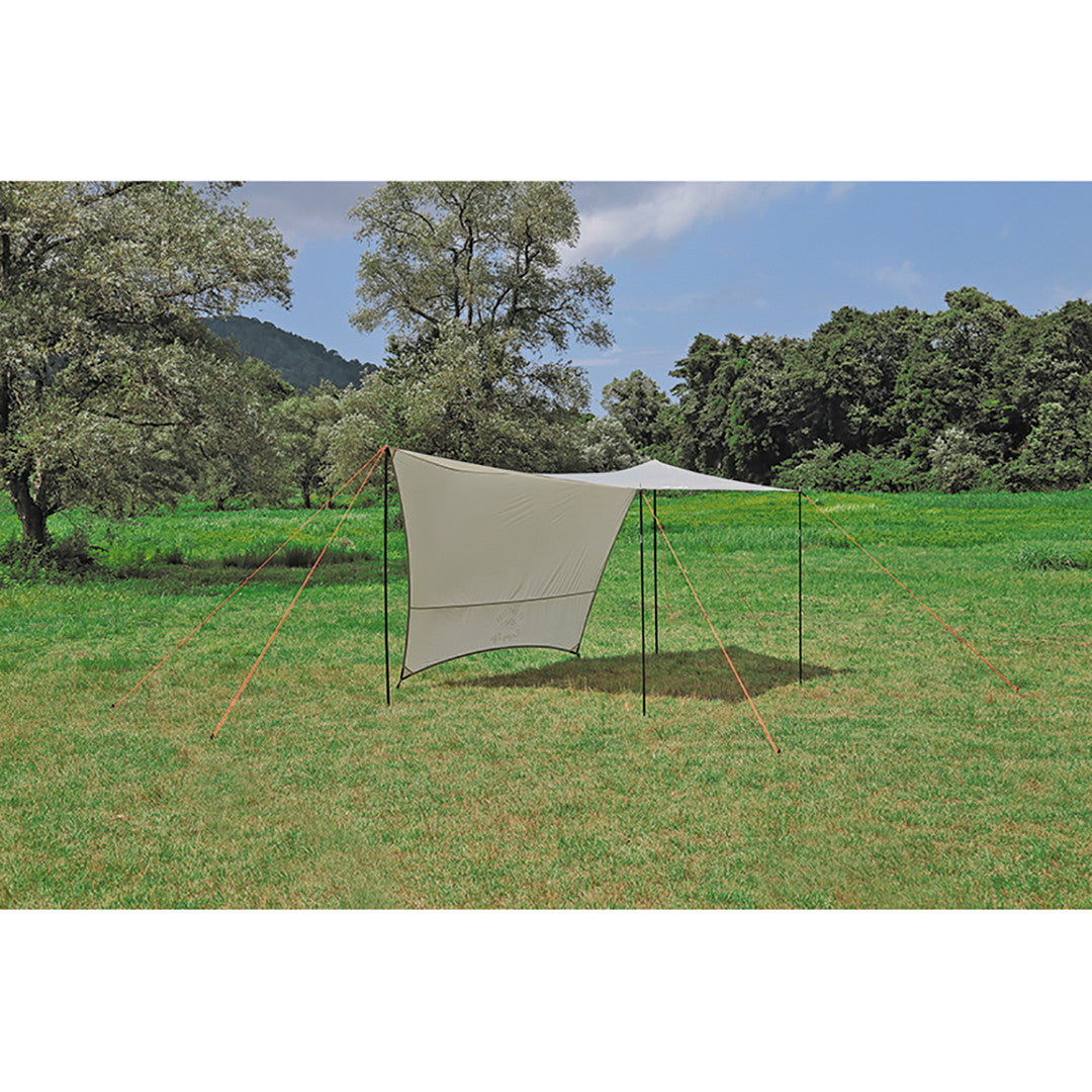 ■4~6人用に最適なリビングスペースを確保できるタープです。多彩なセッティングが可能な6角形型です。ループベルトと三角布で角コーナーを補強、引っ張り強度アップしています。持ち運びや収納に便利なキャリーバッグ付き。