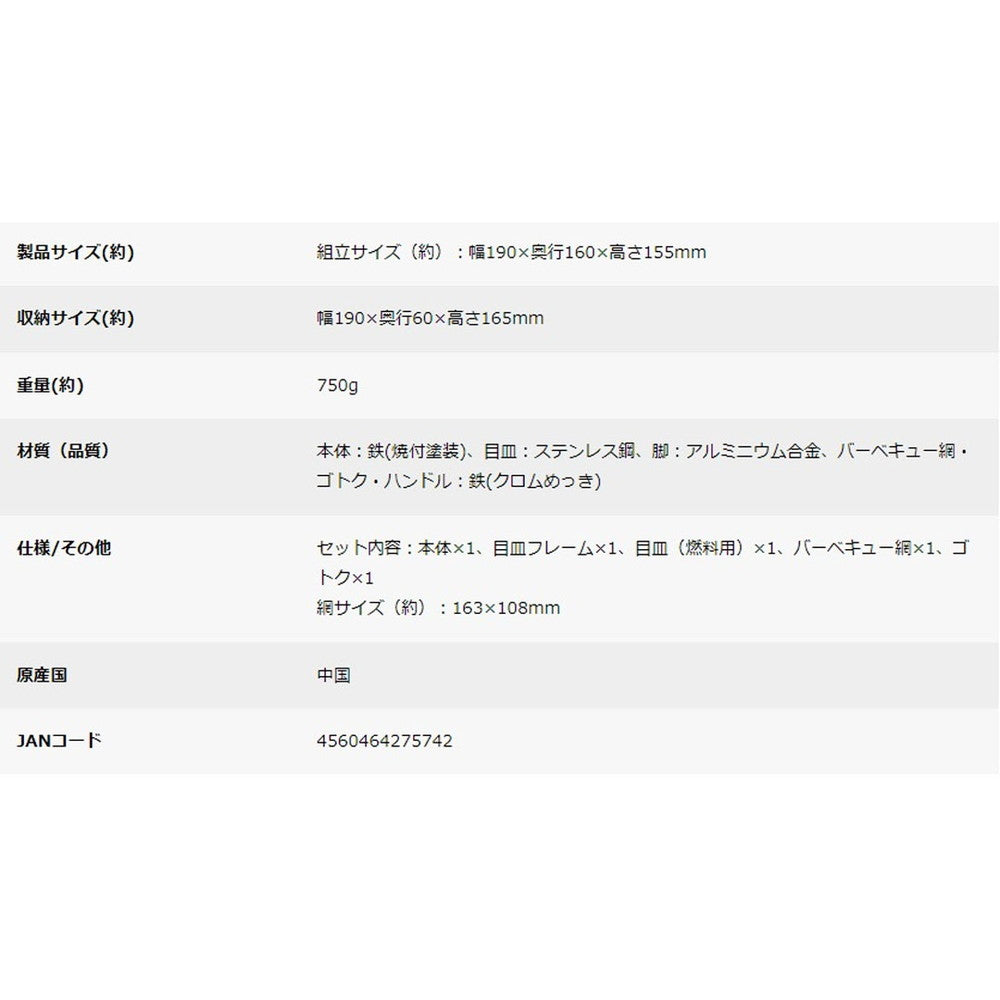 仕様/その他 セット内容:本体×1、目皿フレーム×1、目皿(燃料用)×1、バーベキュー網×1、ゴトク×1