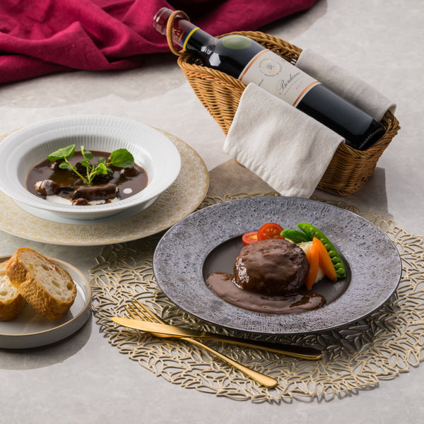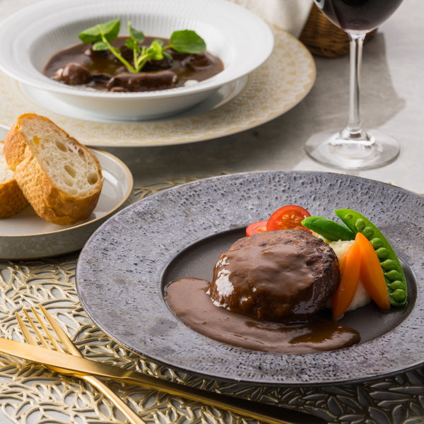 赤ワインとトマト、バターで奥深い味わいに仕上げたデミグラスソースに、温めたときにジューシーさが残るよう軽く焦げ目をつけて焼いたハンバーグと、国産牛肉とぷりぷりのマッシュルームを赤ワインを効かせたデミグラスソースで風味豊かに仕上げた本格フレンチの味わいのビーフシチューの詰合せ。ハンバーグはレンジアップでお召し上がりいただけます。