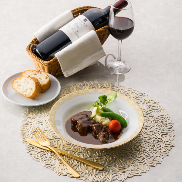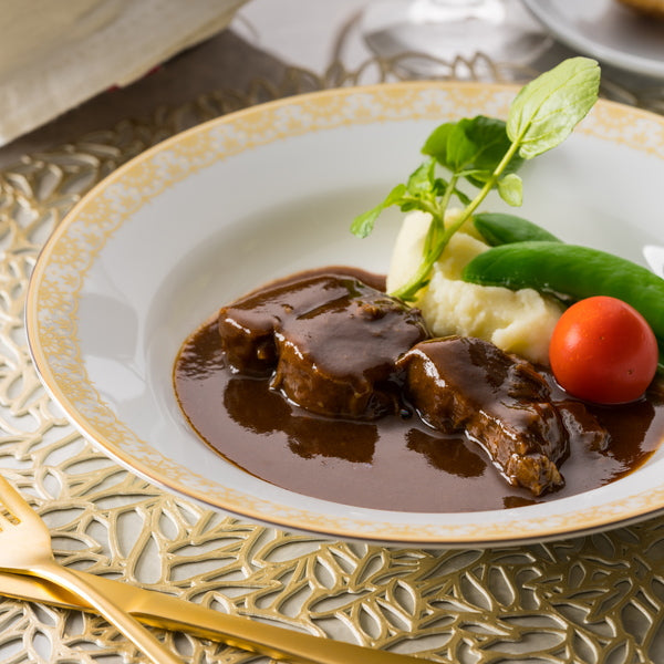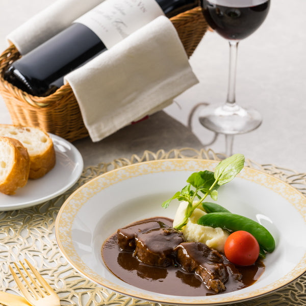 ■【日比谷】モルソー 秋元さくら監修、たっぷりの赤ワインとデミグラスソースで牛すね肉をじっくり煮込み、手間ひまをかけて丁寧に作りました。とろけるような牛すね肉の濃厚で芳醇な味わいをお楽しみください。お好みでマッシュポテトや彩り野菜を添えて頂くとより華やかなメインディッシュとなります。パーティーにもピッタリです。