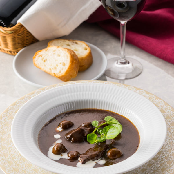 ■六本木リューズ飯塚シェフが監修する濃厚な味わいのビーフシチュー。赤ワインを効かせたデミグラスソースでじっくり煮込み、風味豊かに仕上げました。ぷりぷりのマッシュルームと国産の牛肉の旨みが詰まった、本格フレンチのビーフシチューをお届けします。