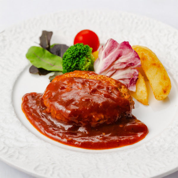 三大和牛の近江牛を使用した、近江牛入りトマトソースハンバーグ。