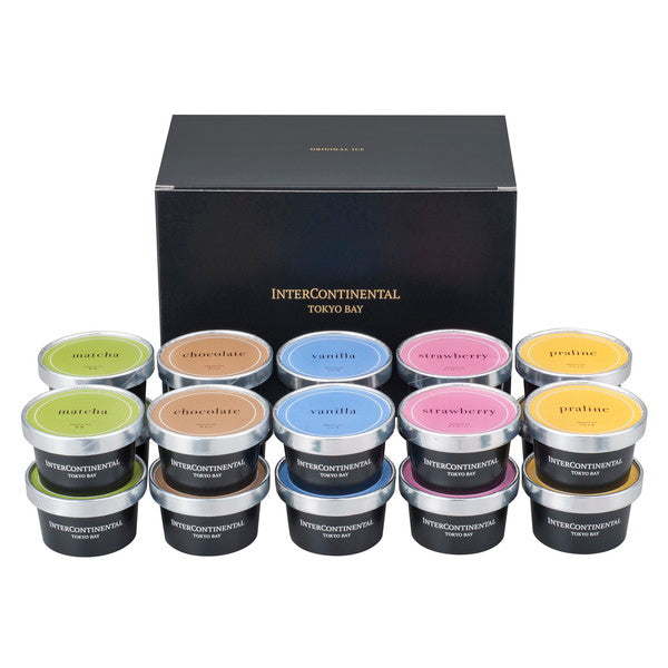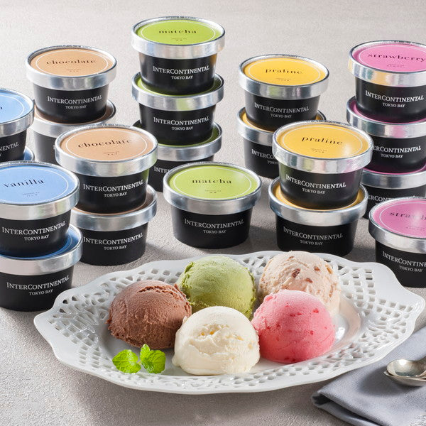 ■素材の味が引き立つよう作りあげたなめらかな口どけのアイス。定番のバニラの他に、シェフおすすめのプラリネなど5種類のフレーバーをセットにしました。