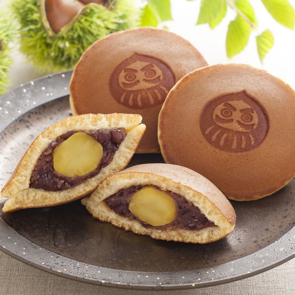 ■柔らかい栗がまるごと1つ入った、可愛らしいどら焼きです。やさしい甘さの国産つぶ餡が、栗の美味しさを引き立てます。