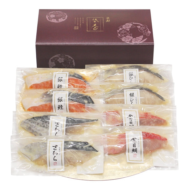 ■商品内容:金目鯛、銀ひらす(ニュージーランド産)・銀鮭(チリ産)・さわら(韓国産)各60g×各2(計8)