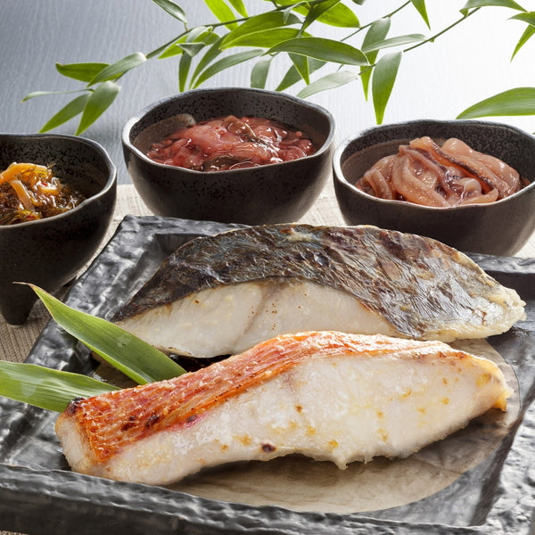 ■商品内容:さわら・金目鯛・銀鮭各60g×各1、松前漬・たこ塩辛・いか塩辛各50g×各1