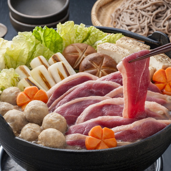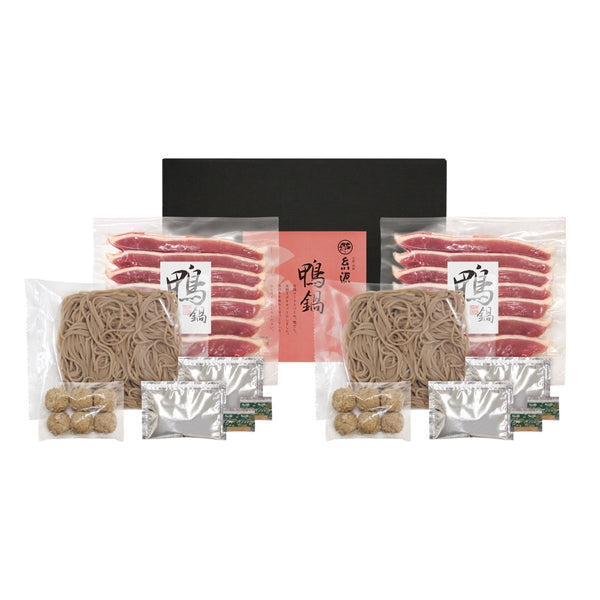 ■合鴨ロースとつくね、鴨だし、五割そばがセットになった鴨鍋です。お好みで野菜や豆腐などを加えてお楽しみください。使いやすい2人前ずつに分けて、お届けします。