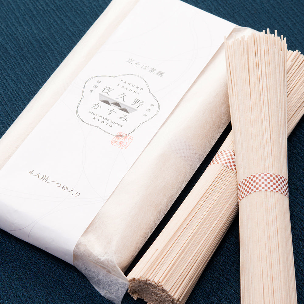 【京そば素麺 夜久野かすみ】良質な京都府産のそば粉、国産小麦粉、塩のみで製麺した、純国産、無添加の1.2mm極細麺です。なめらかでのど越しが良く蕎麦の香りも楽しめる、新しい麺になっております。