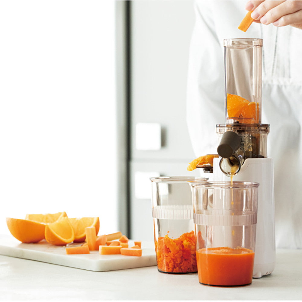 軽量コンパクトで置き場所にも困らない[コールドプレスジューサー ミニ]は、操作も組み立ても簡単でお手入れもラク。