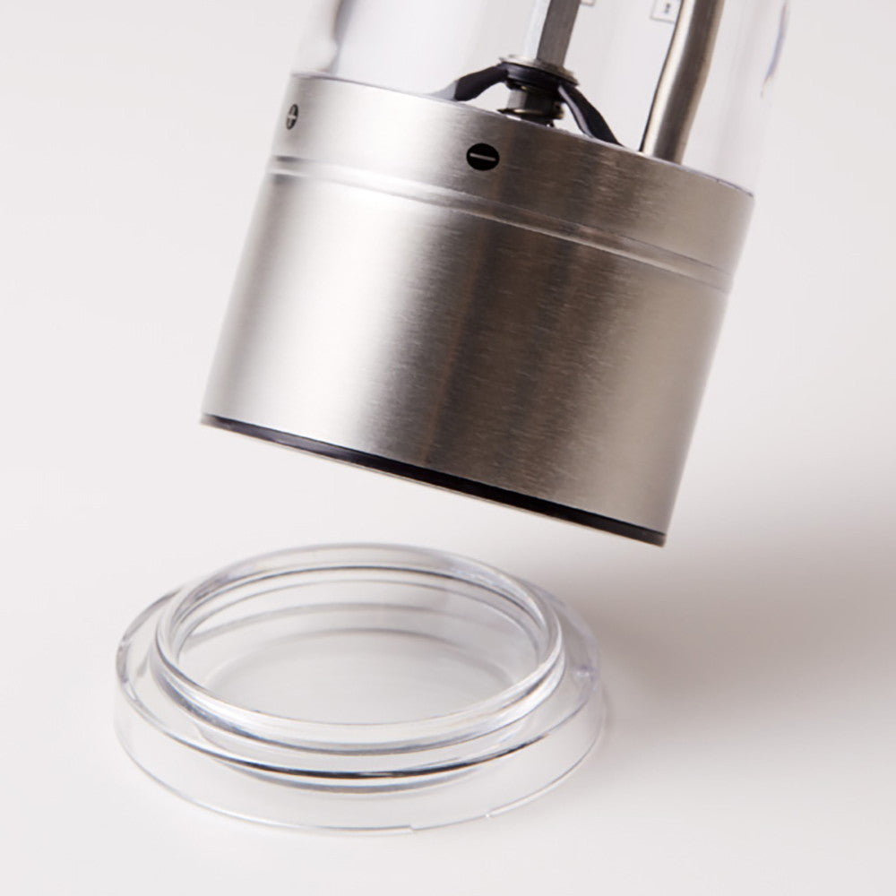 残量が一目でわかるよう、キャビンは透明になっています。また、広めの充填口により、塩や胡椒を容易に入れることができます。
