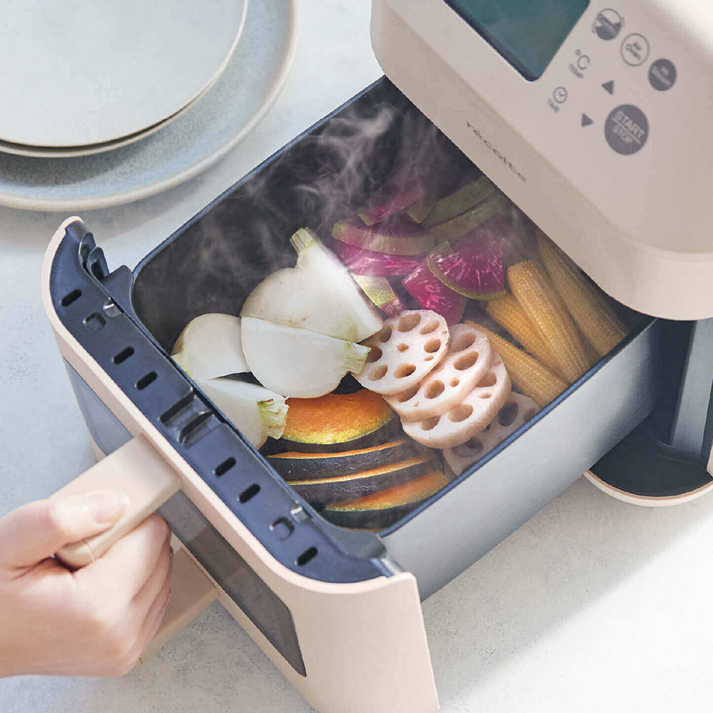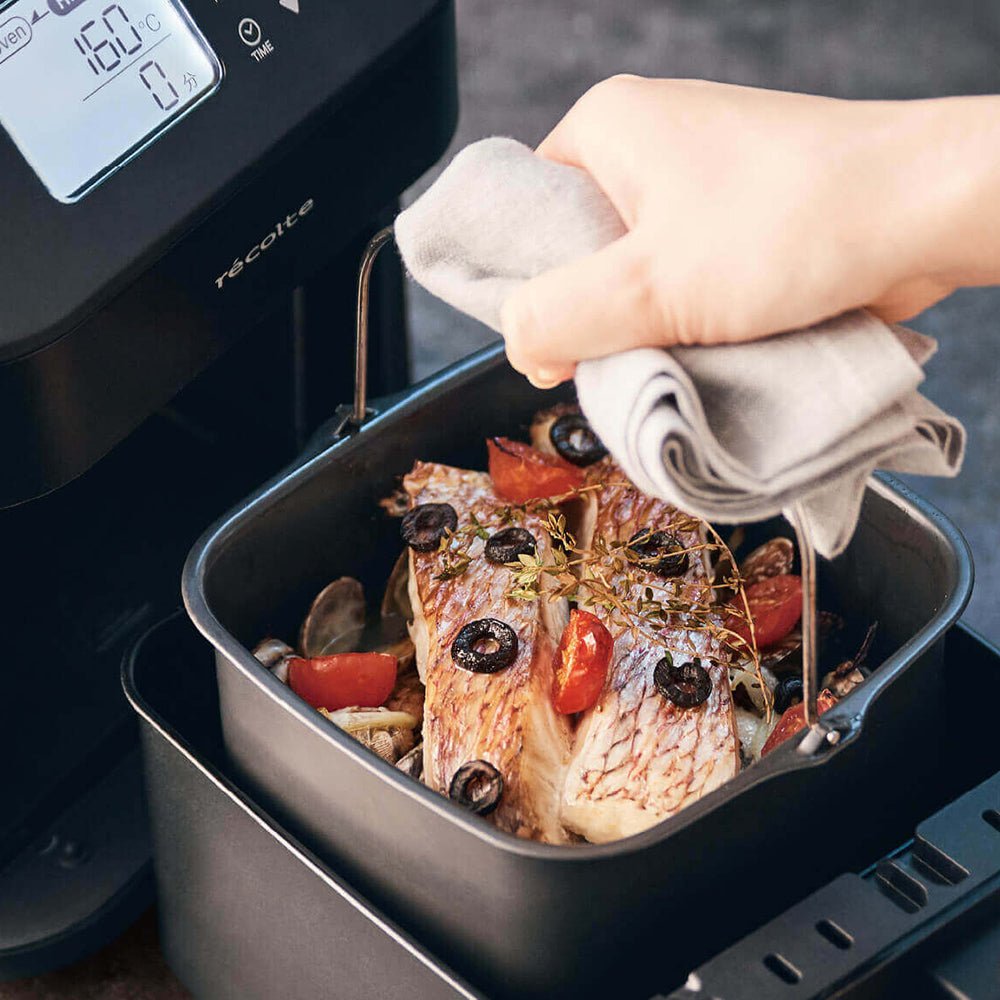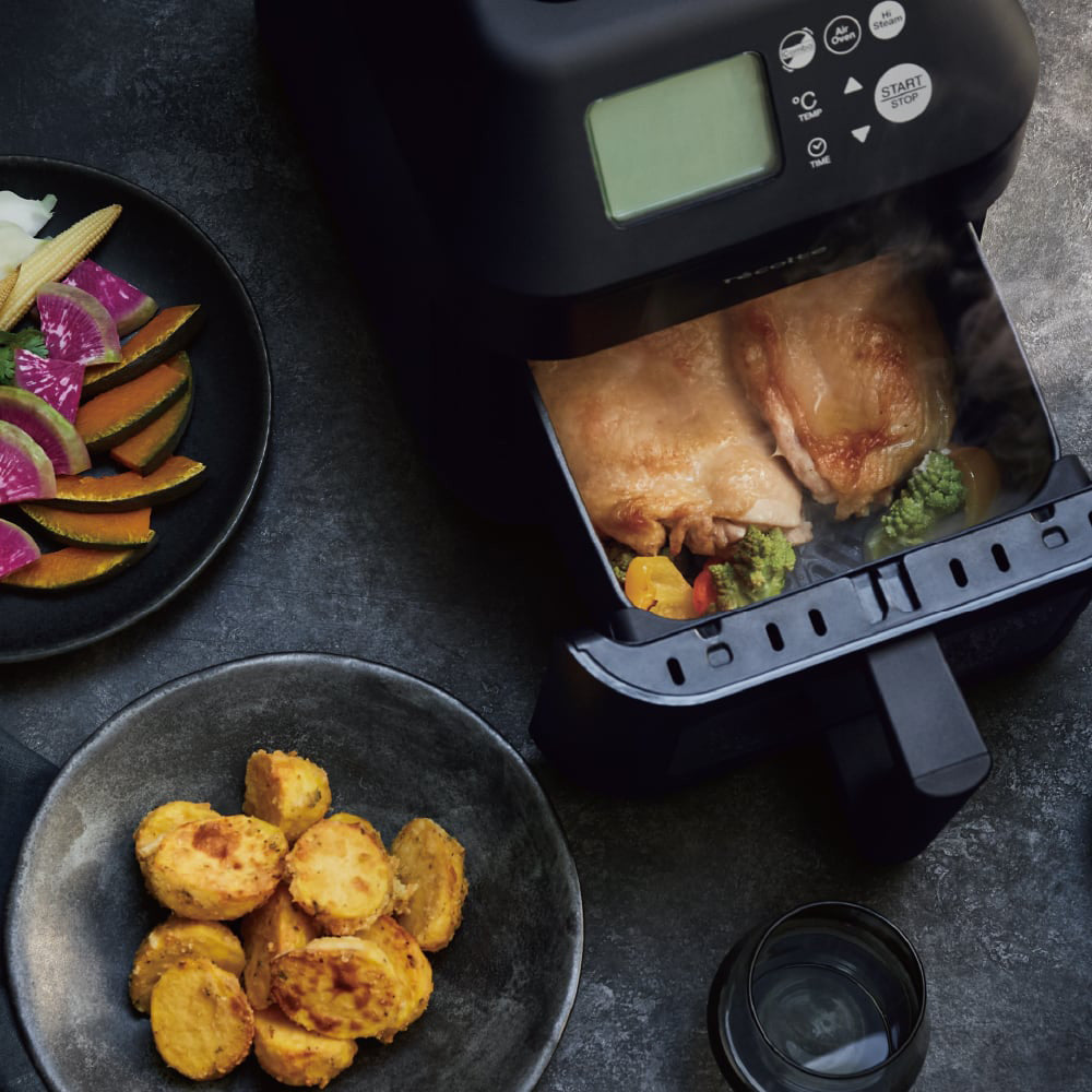大型ファンで最高200℃の熱風を効率よく対流させ、食材をカリッと香ばしく仕上げます。油を使わないノンフライ調理や、総菜の温め直し、冷凍食品の調理にも。