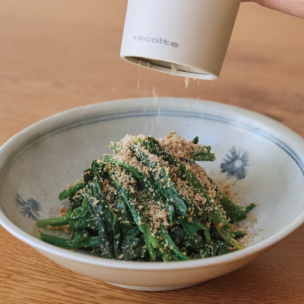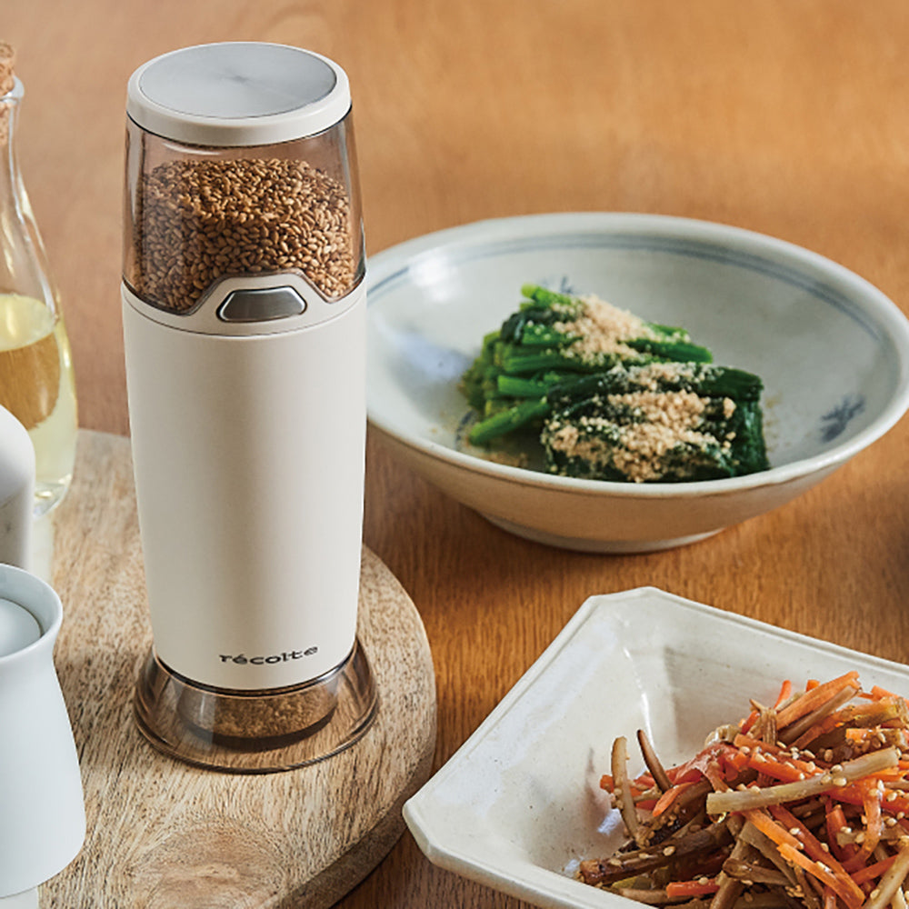 和えもの、スイーツ、薬味など、活躍の広いごま。[電動ゴマスリ]を使えば、香り豊かなごまがあっという間に。パッと手にとってすぐ使えるので、ごまがより身近になります。