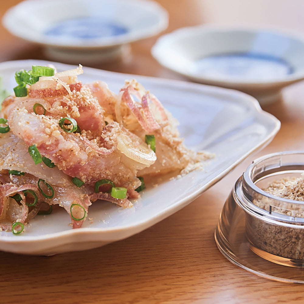ボタンひとつですりごまができる[電動ゴマスリ]。手軽に使えるので、料理の下ごしらえや食卓での仕上げなど、ごまの活躍シーンが広がります。