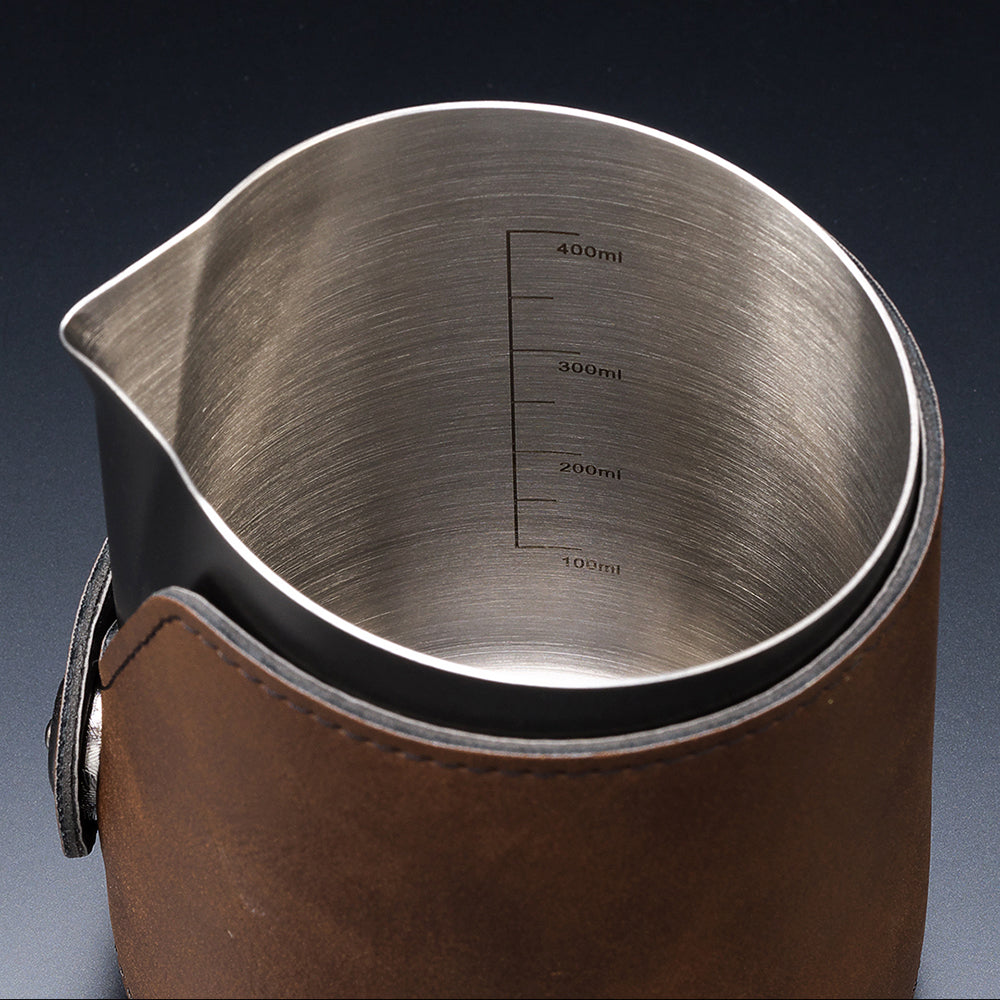 ●斜めにカットされた上端の形状は、ミルクを注いでいるときも中の容量目盛りが見やすく設計されています。注ぎ口は液だれしにくい形状で、流量をコントロールしやすい幅になっています。