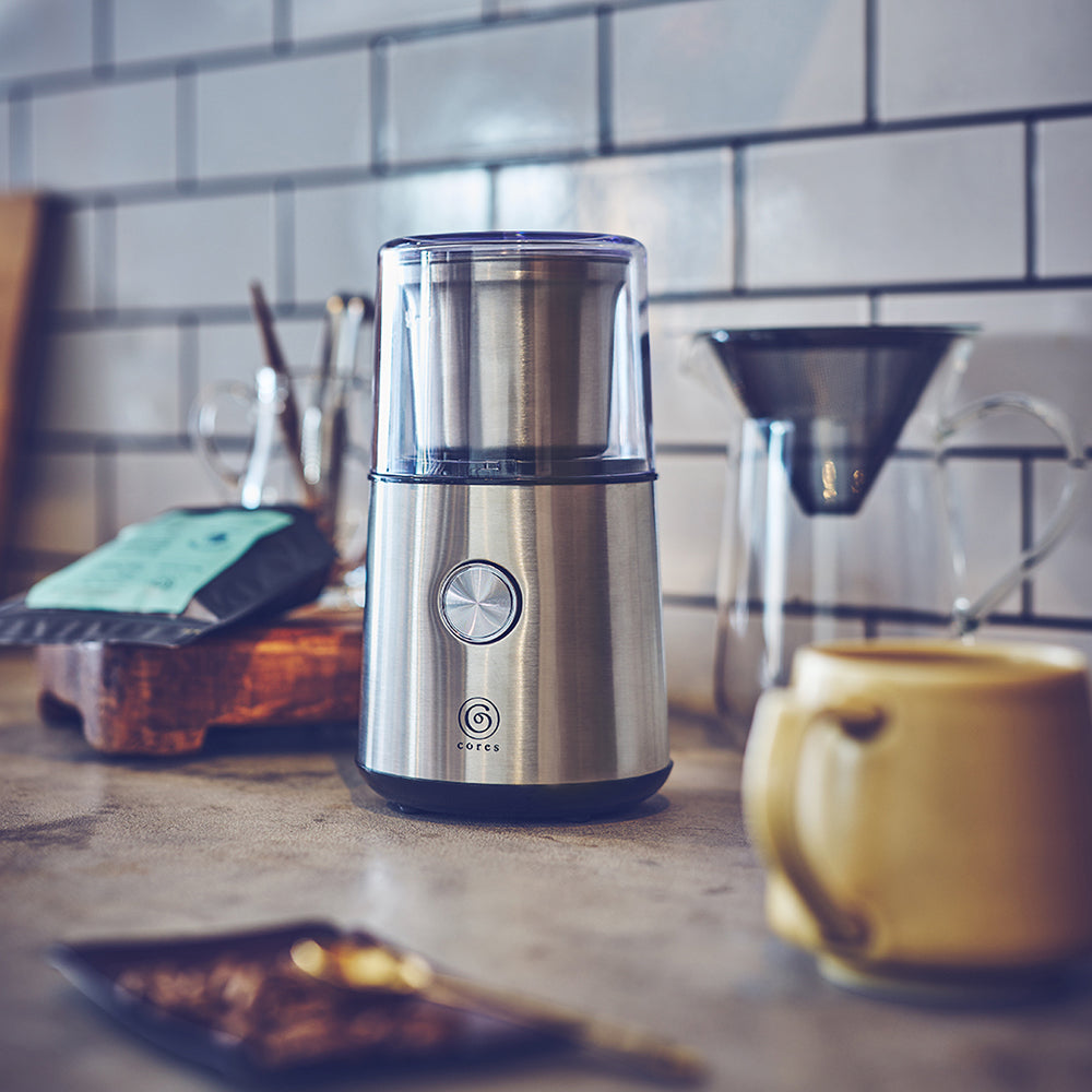 『自宅でもっと美味しいコーヒーを味わいたい』と、思い始めたなら、まず電動プロペラ式のコーヒーグラインダーをご用意することをお勧めします。豆からの挽きたてを使うだけで、ドリップコーヒーの美味しさは増します。Coresブレードコーヒーグラインダーなら、場所をとらず、構造が単純でお掃除しやすく、スイッチひとつのシンプル操作で、手軽にコーヒー豆を挽けるグラインダーです。豆の挽き始めからコーヒーフレーバーに包まれ、自宅でのコーヒータイムが更に豊かなひとときになります。