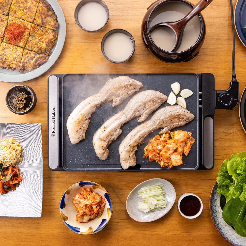 友人を招いての食事なら、並べた料理皿に加えてホットプレート料理もあるとテーブルが華やぎます。保温プレートとしても使えるので、おしゃべりに夢中になっている間に冷める心配がありません。