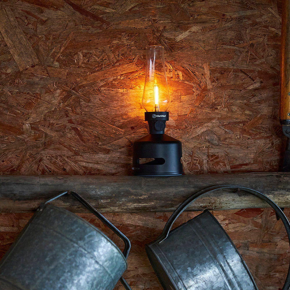 ノスタルジックなフォルムに現代的な機能、ワイヤレスBluetoothスピーカーが隠されスマホなどとペアリング音源再生、ロウソクの灯りを想わせるLEDは暖かく空間を灯します。