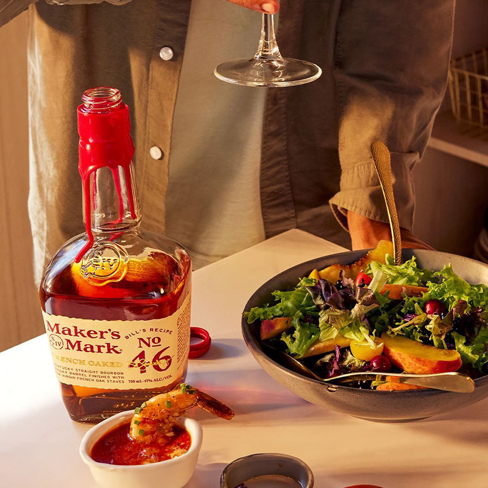 メーカーズマーク46は、大胆な個性を与えるために熟練の技で仕上げられた原酒に、特別な焦がしを施したフレンチオークのステーブ(板)を加え、さらに熟成を重ねてつくります。これは、創業者のビル・サミュエルズ・シニアとマージー・サミュエルズの息子、ビル・サミュエルズ・ジュニアの発案によって生み出されました。