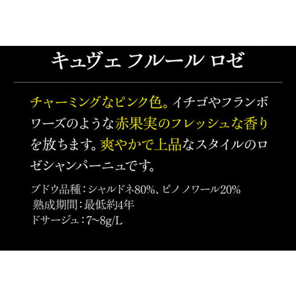 ■「フルール(花)」の名の通り、シックなブラックボトルに鮮やかな花が散りばめられた、日本初入荷のキュヴェのセット。見た目にも華やかで、記念日の贈り物やパーティーなど様々なシーンに映えます。