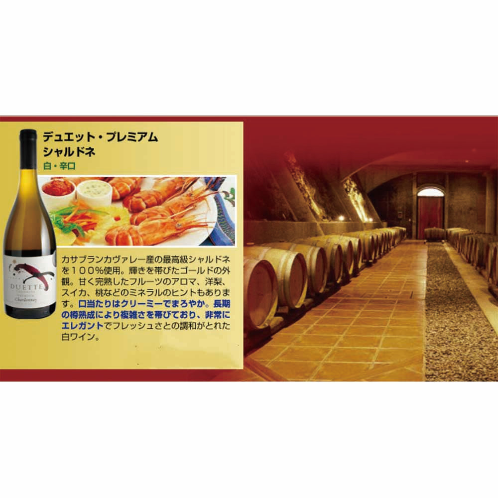 ■カサブランカヴァレー産の最高級シャルドネを100%使用。輝きを帯びたゴールドの外観。甘く完熟したフルーツのアロマ、洋ナシ、スイカ、桃などのミネラルのヒントもあります。口当たりはクリーミーでまろやか。長期のたる熟成により複雑さを帯びており、非常にエレガントでフレッシュさと調和のとれた白ワイン。